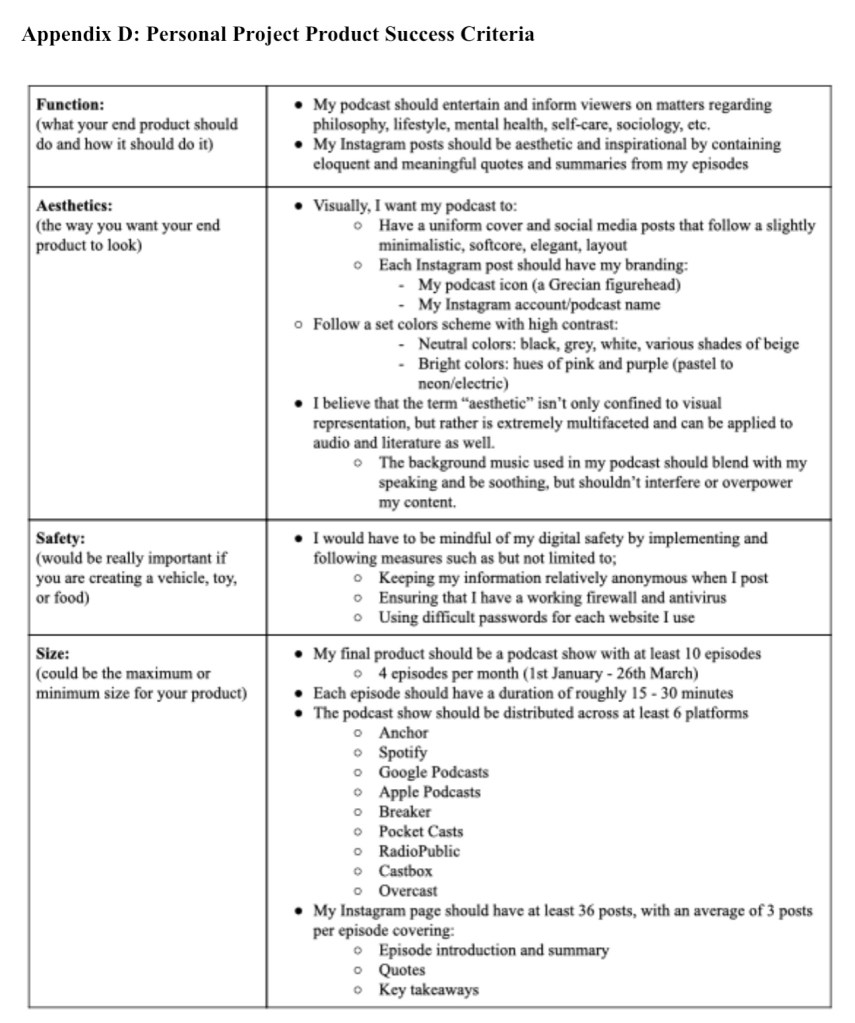 - You need to create criteria for your project that you can reflect on your progress with. There are examples in the samples.