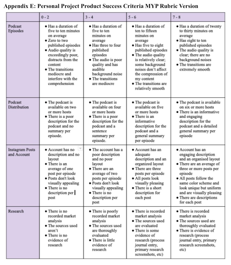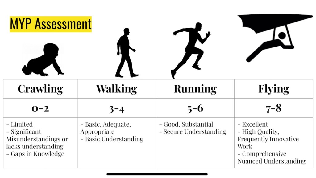 - Try to come up with some categories and create the criteria like an MYP rubric 1-2, 3-4, 5-6, 7-8