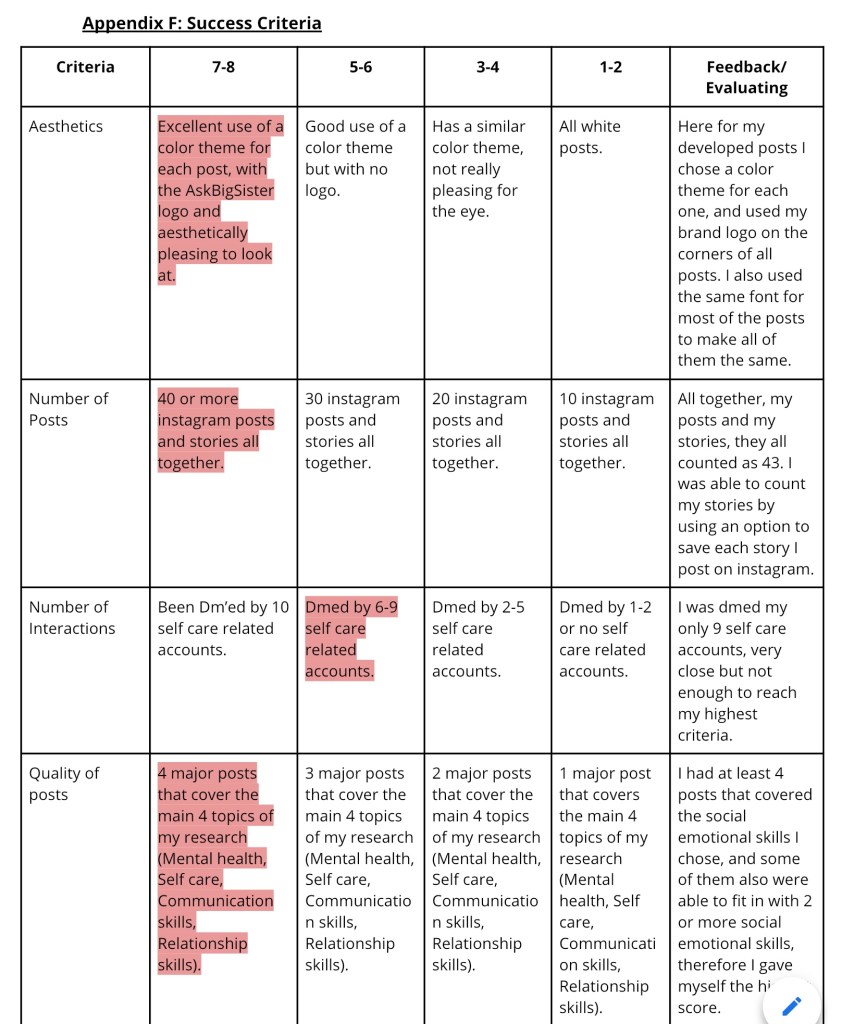 - Add a section/ chart to appendix detailing how you met your criteria.